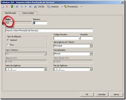 O ISS é o único tributo que o sistema consiste a sigla cadastrada no tributo, sempre deve ser ISS, nunca cadastre ISS 1 ou ISS 2 ou etc: