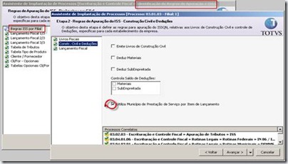 Para isto a opção "Utiliza Município de Prestação de Serviço por Item de Lançamento" deve estar habilitada em Opções | Parâmetros | Gerais Tabelas | Identificação de Regras de Apuração | ISS | Regras ISS por Filial | Editar a Filial | Const. Civil e Deduções, dessa forma o sistema irá considerar o tributo informado na aba Outros Tributos do “item” do lançamento fiscal, observando que o município é a codificação do serviço deverão estar informadas na aba Outros Dados sub- aba Prestação de Serviço também do “item”.